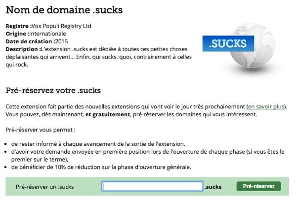 D’ailleurs, le nom de domaine .SUCKS semble avoir été créé uniquement pour cela. Quel aspect positif peut-il y avoir à créer un nom de domaine avec une telle extension ? Aucun. C’est donc une forme d’extorsion que les entreprises semblent d’ailleurs rejeter en bloc. Le .SUCKS n’existe pas encore réellement, mais est d’ores et déjà pré-réservable et assuré de rencontrer un grand succès, au moins grâce aux enregistrements défensifs des marques, personnalités et utilisateurs lambdas inquiets de leur image virtuelle…
