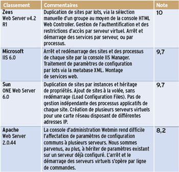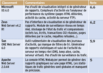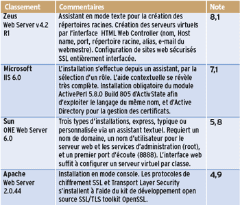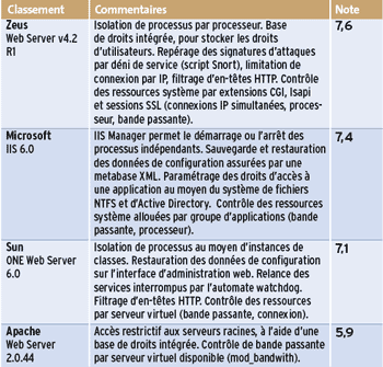 meilleure tenue en charge. Pour la gestion des utilisateurs, seuls Zeus et Apache disposent d’une base de droits intégrée, mais tous proposent le filtrage d’en-têtes HTTP. Seuls Sun ONE Web Server et Microsoft IIS 6.0 intègrent des mécanismes de