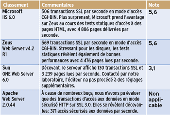 Les serveurs web de Zeus et de Microsoft affichent des performances transactionnelles comparables. Sun semble plus pénalisé que Microsoft par l’absence de serveur d’applications. Quant à Apache, la configuration mise en place