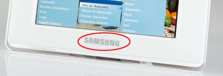 On n’aime pas… l’omniprésence du logo SamsungVraiment très intrusif, l’énorme logo de la marque ! Si encore Samsung offrait ses cadres, vous pourriez tolérer que vos photos servent de support publicitaire. Mais ce n’est bien évidemment pas le cas. Et si, en plus, vous