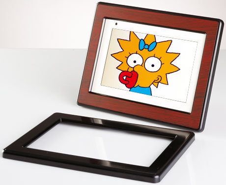 On aime… les cadres interchangeablesSympa, la possibilité de changer la décoration du cadre en fonction de l’endroit où on le posera, même si on sera probablement tenté d’écarter d’office la décoration faux acajou qui fait vraiment kitsch. A moins, pourquoi pas,