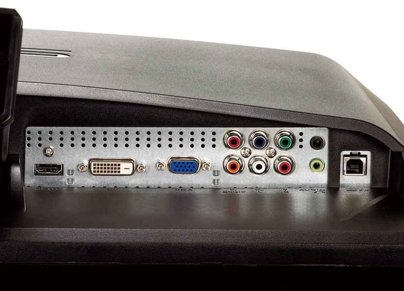 Malgré le prix le plus bas de notre comparatif, cet écran est un des plus fournis en connectique vidéo, juste derrière le modèle de LG. Il dispose des classiques entrées VGA et DVI (les câbles correspondants sont livrés), d’une prise HDMI et même d’une entrée Composante YUV (analogique haute définition).