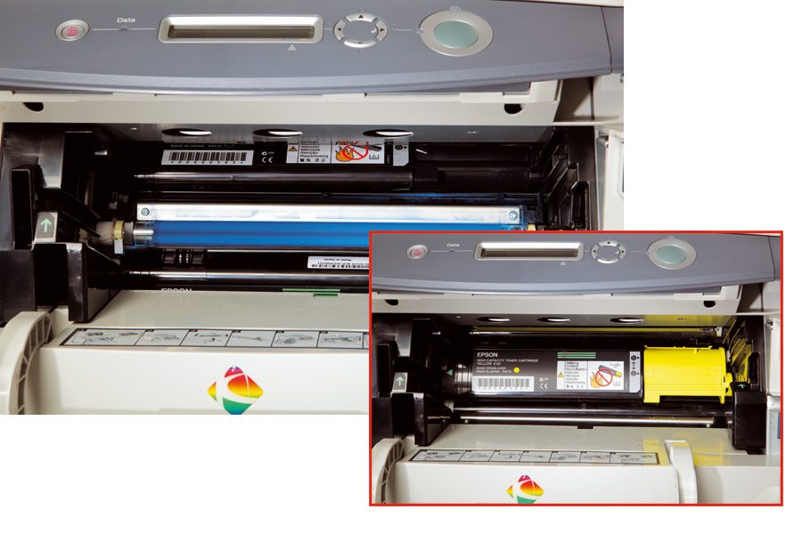 Curieux système que celui de cette AcuLaser C1100 : un carrousel rotatif où chaque cartouche est chargée l’une après l’autre à la manière des balles d’un revolver. Ce n’est ni pratique ni propre et ça nécessite à la fois du temps et de la dextérité.