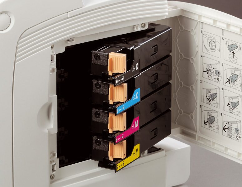 Remplacer les cartouches d’encre usagées par des neuves est parfois un travail fastidieux, voire salissant. Mais pas avec la Phaser 6125 de Xerox. Ici, on se borne à insérer les quatre petites cartouches réservoir dans les logements basculants ad hoc, à verrouiller les loquets et à refermer la trappe. Facile et propre !