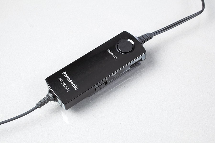 Ce Panasonic est un modèle de voyage peu encombrant. Revers de la médaille, il doit utiliser un boîtier externe pour recevoir la pile servant au système d’annulation de bruit. Ce boîtier est assez peu encombrant (6,7 x 2,4 cm) et on peut le clipser à un vêtement grâce à sa pince. En plus d’accueillir une pile AAA, il possède un bouton de réglage du volume, un interrupteur d’activation du système antibruit et un bouton pour suspendre musique et réduction de bruit afin de prendre part à une conversation