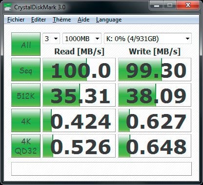 Le disque dur Buffalo du MiniStation tourne à 5 200 rotations par minute au lieu de 5 400 rotations par minute. Une différence qui semble anecdotique, mais qui, en pratique, a un impact net sur les performances de ce modèle. Mais il est loin d’être le plus lent de ce comparatif.