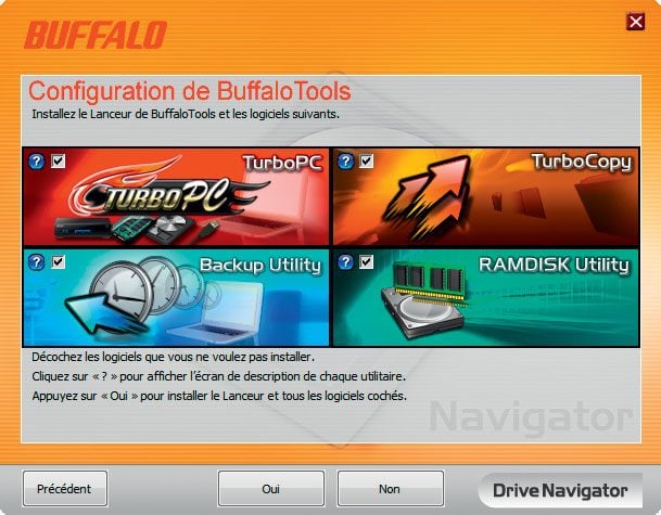 Malgré un prix très raisonnable, l’offre logicielle qui accompagne le disque MiniStation de Buffalo est de qualité. Citons notamment les programmes d’optimisation de transferts TurboPC et TurboCopy, et le logiciel permettant de configurer la mise en veille du disque dur en cas d’inactivité.