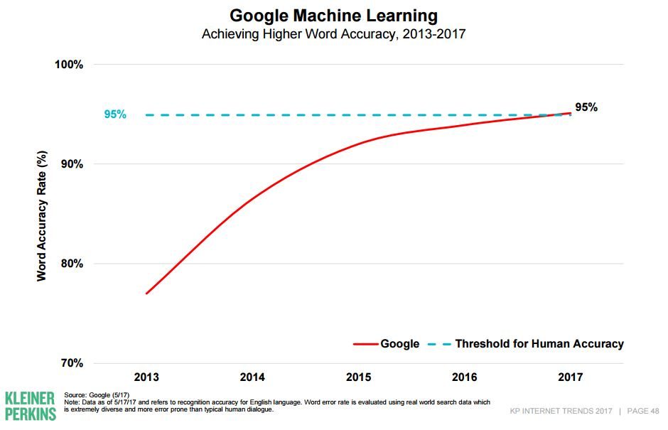 - La recherche vocale commence à remplacer les requêtes traditionnelles. 20% des requêtes mobiles ont été faites via la voix en 2016 et le succès de haut-parleurs équipés d’assistants virtuels comme Amazon Echo aux Etats-Unis est notable. Sans compter que la technologie s’améliore : Google a atteint cette année une sensibilité égale à celle de l’homme en matière de reconnaissance vocale des mots en anglais, soit 95%.