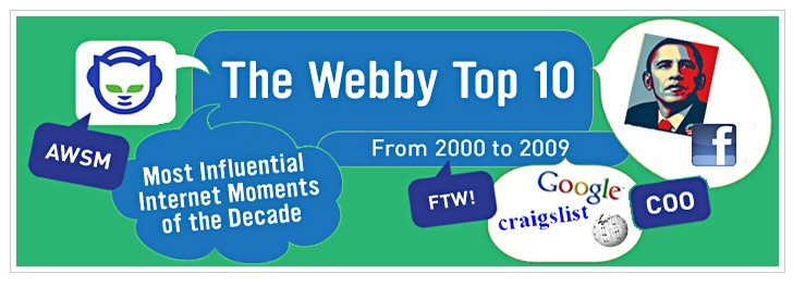En prélude à cette grand-messe qui aura lieu en avril prochain, les « Webbys » ont choisi de distinguer dix événements majeurs de la décennie qui s’achève, du succès de Craigslist en 2000 à l’émergence de Twitter comme moyen d’expression, comme cette année en Iran.