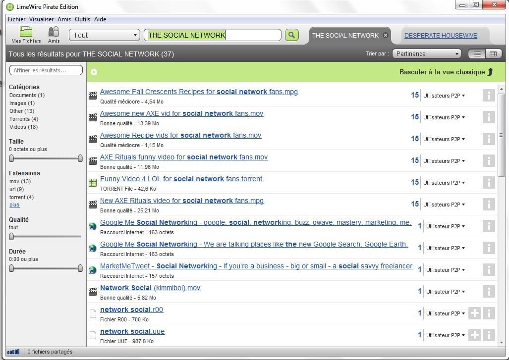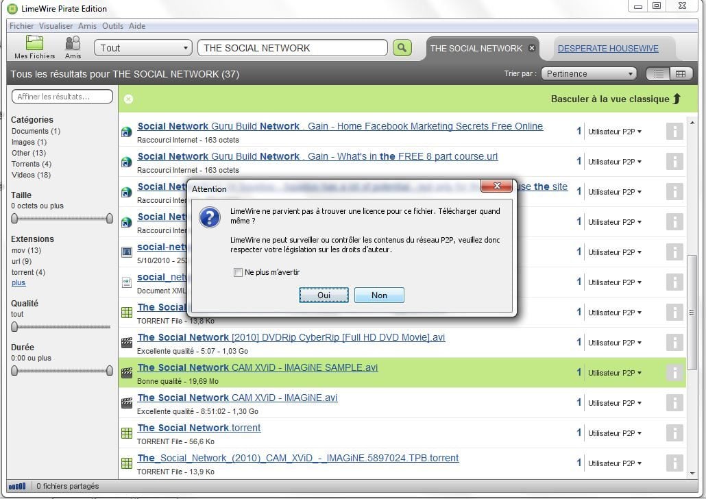 Une fois installé, le logiciel permet de faire une recherche sur un titre avant de proposer plusieurs sources de téléchargement. Tapez « The Social Network », et pas moins de 18 vidéos pirates du film de David Fincher sont proposées. Les internautes qui vont jusqu’au bout de l’opération ne pourront pas feindre d’ignorer l’illégalité de leur démarche. Avant le début du téléchargement, un message indique : « LimeWire ne parvient pas à trouver une licence pour ce fichier. Télécharger quand même ? » Une manière de se dédouaner et de renvoyer la responsabilité de cette pratique sur les internautes.