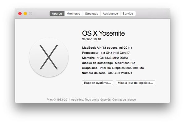 Pour savoir à quel modèle vous avez à faire, rendez-vous dans le menu Pomme, puis A propos de ce Mac. Un résumé s’affiche qui vous indique en dessous du nom de l’OS de la date de sortie de votre Mac. Ici, un MacBook Air 13 pouces sorti mi-2011.