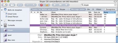Comme dans le Finder, les requêtes peuvent être enregistrées. Ce faisant, on crée un répertoire ‘ intelligent ‘ dont le contenu est mis à jour en permanence. Avantage sur les filtres traditionnels, les messages
