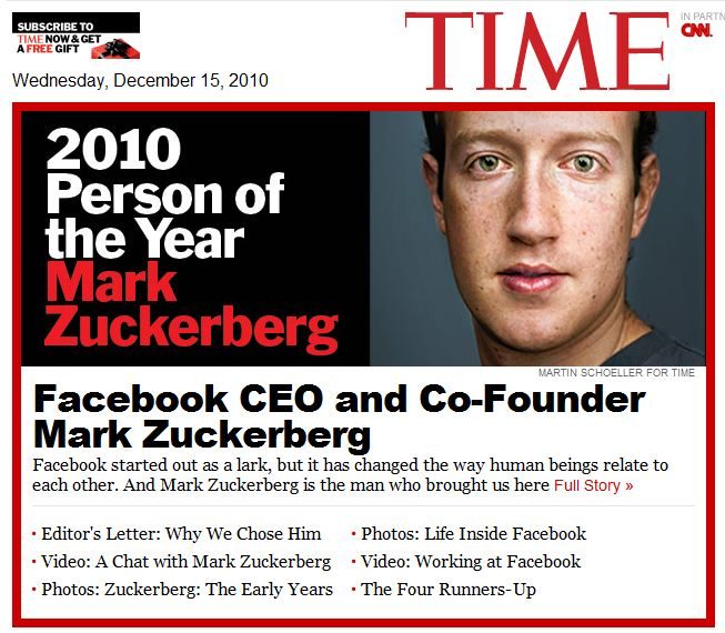 « Pour avoir mis en contact plus d’un demi milliard d’individus, tissé des relations sociales entre eux, pour avoir créé un nouveau système d’échange d’informations et pour avoir changé la manière dont nous vivons nos vies, Mark Elliot Zuckerberg est l’homme de l’année 2010 pour le Time », a jugé le magazine. Le jeune homme est apparu sur le devant de la scène cette année avec la sortie de The Social Network, un film retraçant la création de Facebook.