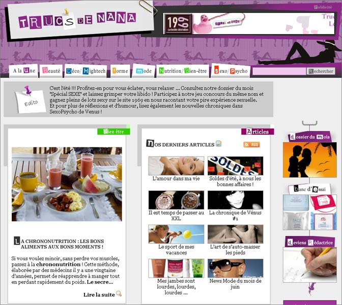 Dans ce nouveau webzine féminin, figurent les habituelles rubriques beauté, bien-être, sexopsycho, mode et forme. Les sujets manquent totalement d’originalité et les articles, pas toujours très bien écrits, sont truffés de coquilles
