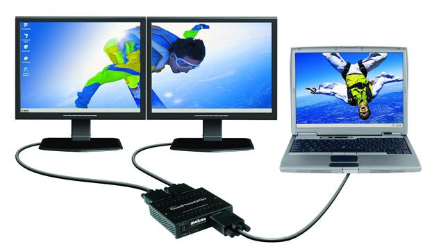 résolution (2 560 x 1024 pixels) n’est exploitable qu’en 60 Hz, ce qui limite son utilisation à des écrans LCD.En pratique, l’image est générée par Windows dans l’une de ces deux résolutions, puis le boîtier la coupe en deux littéralement afin d’afficher les parties gauche et droite sur chacun des écrans. Sur les portables récents, qui peuvent