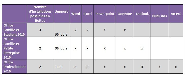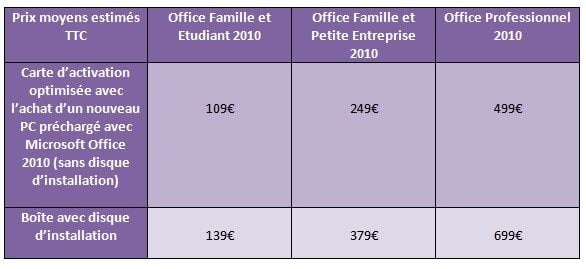 Trois versions seront proposées à celui-ci et aux PME : Office Famille et Etudiant 2010, Office Famille et Petite Entreprise 2010 ainsi qu’Office Professionnel 2010 (voir tableau ci-contre pour le contenu de chacune). La première sera livrée avec trois licences d’installation.