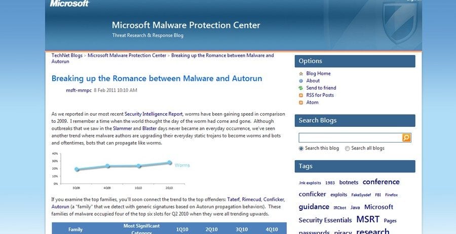 Ce correctif supprime le fonctionnement d’Autorun pour les médias USB, mais pas les disques optiques, directement poussés par Microsoft. Cette « mise à jour » s’applique à XP, Server 2003, Vista et Server 2008. Dans un billet publié sur un blog officiel consacré à la sécurité, Microsoft justifie son choix en montrant l’explosion du nombre de vers se déployant grâce à cette fonction.