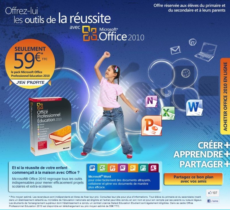 Office à moitié prix ? C’est possible sous certaines conditions. Microsoft étend aux élèves de l’école primaire et secondaire l’offre promotionnelle destinée aux étudiants. L’éditeur leur réserve un tarif spécial particulièrement intéressant : 59 euros pour une version téléchargeable d’Office Professionnel Education 2010 incluant Word, Powerpoint, Outlook, Excel, OneNote, Access, Publisher, Infopath, SharePoint Workspace et Communicator.