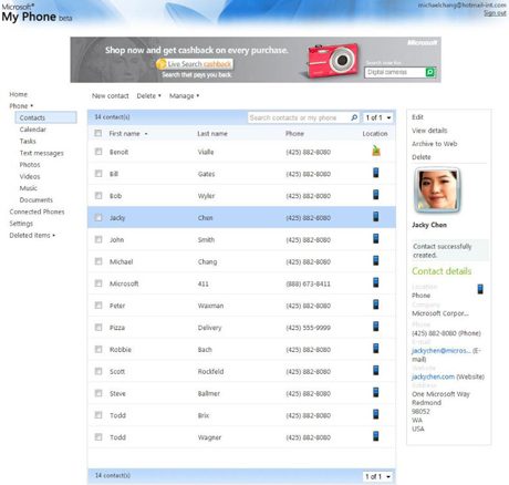 service gratuit de sauvegarde et de synchronisation mobile. Pour l’instant cantonné à une version bêta sur invitation privée, il devrait être généralisé avec l’arrivée des premiers Windows phones.My Phone offre 200 Mo de stockage aux utilisateurs de terminaux Windows, là où Apple facture 79 euros par an pour 20 Go aux utilisateurs de Mobile Me. Sur My Phone, il est possible de sauvegarder non seulement ses