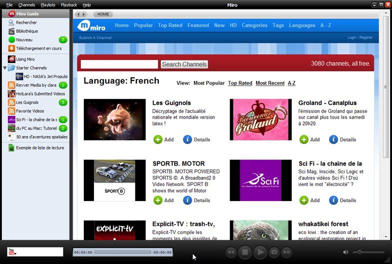 Miro dispose dun guide des programmes très pratique avec classification par thèmes, par langues (idéal pour isoler les contenus francophones qui sont très nombreux), par popularité, par ordre alphabétique. Il y a même un moteur de recherche de