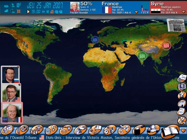 aussi les bras de fer avec le Parlement, les syndicats, vos partenaires étrangers. A vous enfin la gloire ou… la chute dans les sondages !Ambitieux, ce ‘ simulateur de géopolitique ‘ a tout prévu pour rendre l’expérience du pouvoir la plus réaliste possible. Hélas, les bugs d’affichage ou de l’intelligence artificielle, sources d’incohérences,