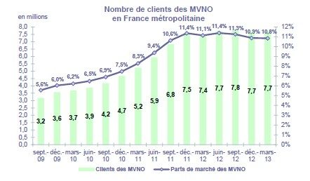 Cette tendance a clairement desservi les MVNO, dont la croissance a été stoppée net vers la même époque. Depuis, les parts de marché des MVNO ne cessent de décroître petit à petit, passant de 11,4 % en décembre 2011 à 10,8 % en mars 2013. Le nombre de clients MVNO stagne autour de 7,7 millions de personnes.