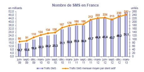 Autre tendance qui se confirme : l’explosion du SMS. La France a atteint un nouveau record en la matière, avec 51 milliards de textos échangés en un seul trimestre. Ce qui équivaut à une moyenne de 241 SMS envoyés par mois et par utilisateur actif. Cette croissance devrait continuer, avec la généralisation des forfaits avec SMS illimités. A long terme, le SMS risque néanmoins d’être concurrencé par les applications de messageries instantanées, comme le souligne une récente étude.