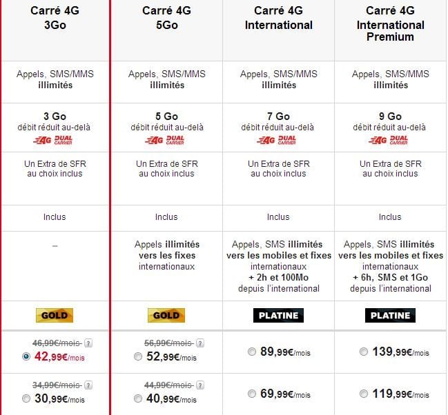 L’opérateur a également dévoilé les tarifs de ses deux forfaits haut de gamme “Carré 4G International” (7 Go et 9 Go) incluant des volumes d’Internet mobile utilisables à l’étranger sans surcoût. Leurs prix varient de 69,99 euros à 139 euros.