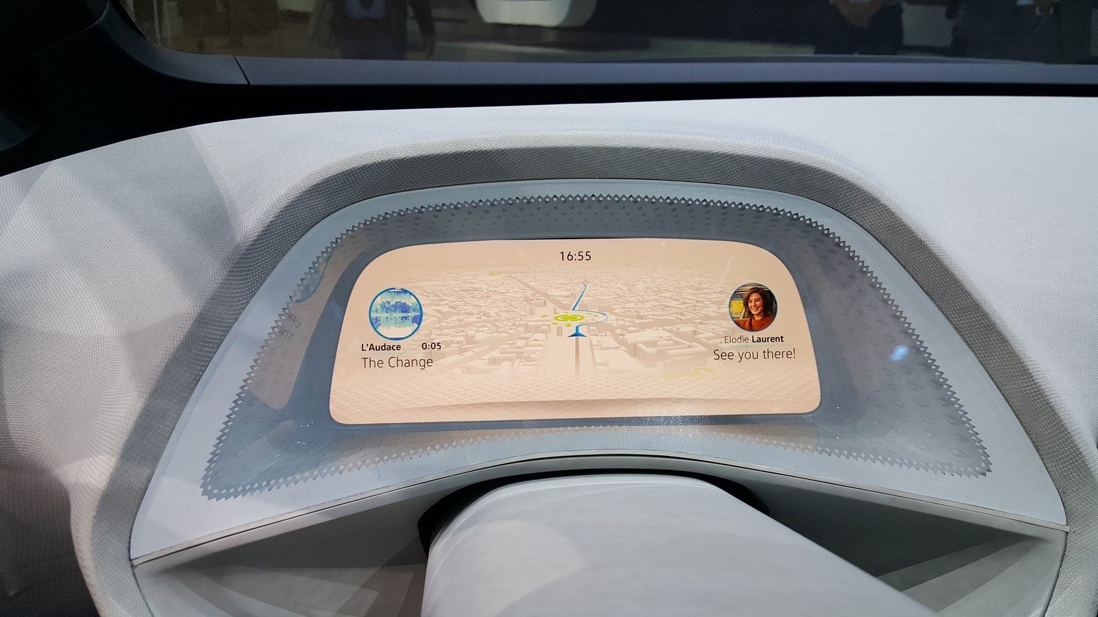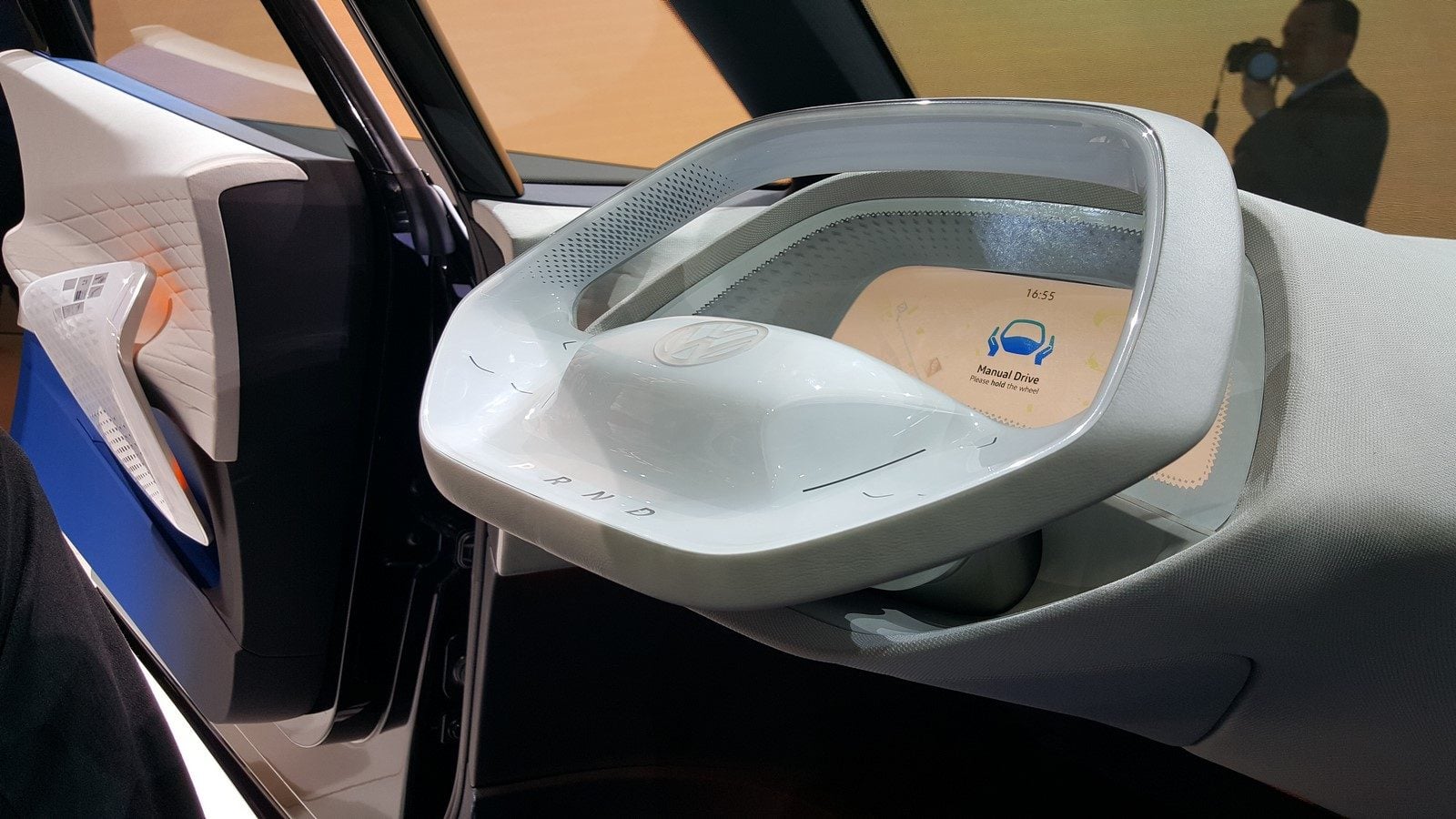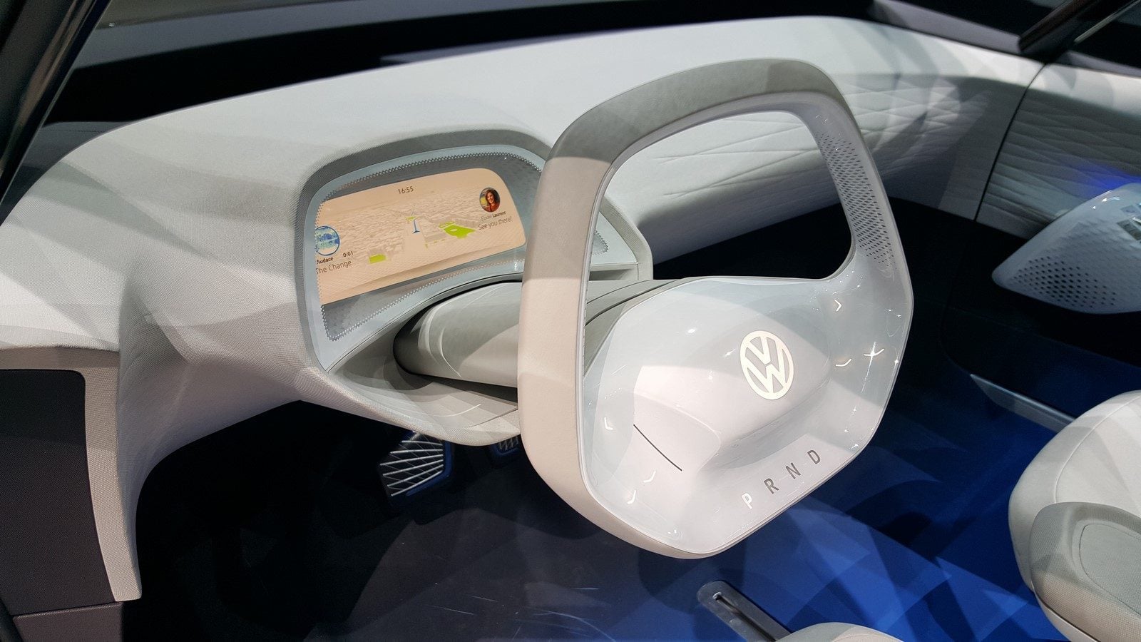 Le concept ID est imaginé comme un véhicule électrique qui arrivera dans la gamme en 2020 et sera autonome dès 2025. Du coup, il suffit d’apposer la main sur le logo VW présent sur le volant pour faire ressortir, ou rentrer le volant dans la planche de bord.