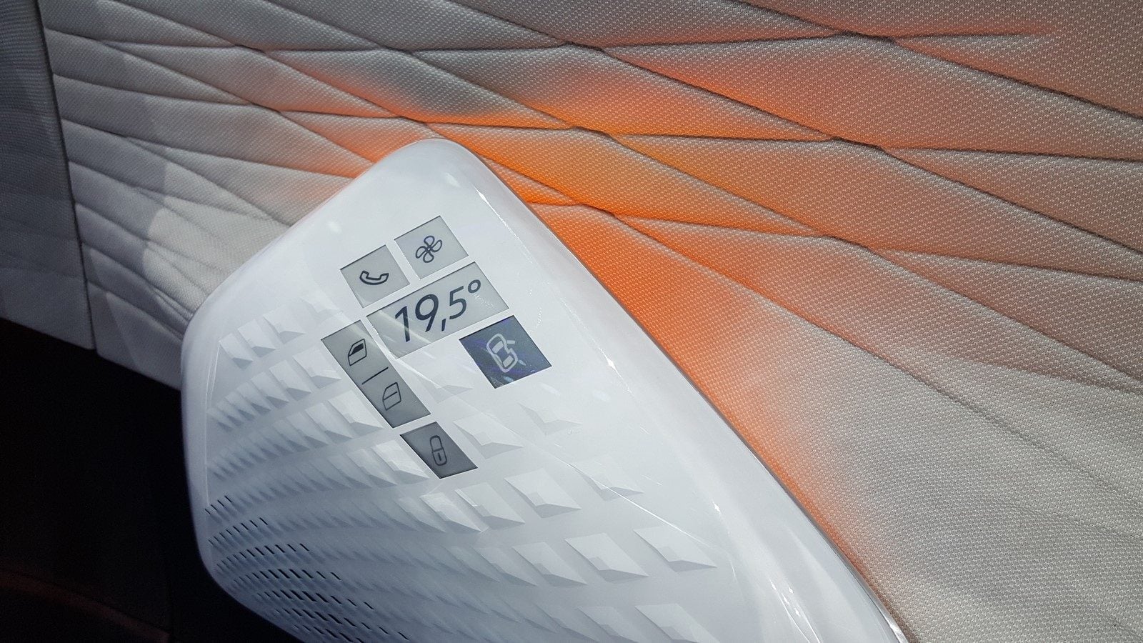 En plus du volant motorisé, on trouve d’étranges ronds rétroéclairés de bleu où viendront se loger, selon Volkswagen, les capteurs dédiés à la conduite autonome.