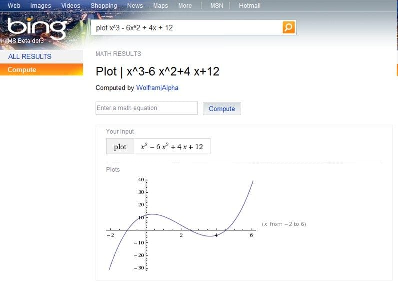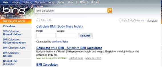 Les résultats que WolframAlpha fournira directement au sein de Bing concerneront la nutrition (vitamines et protéines contenues dans tel ou tel aliment, par exemple, calcul de l’indice de masse corporelle…) et les mathématiques (fonctions complexes ou simples, concepts…)