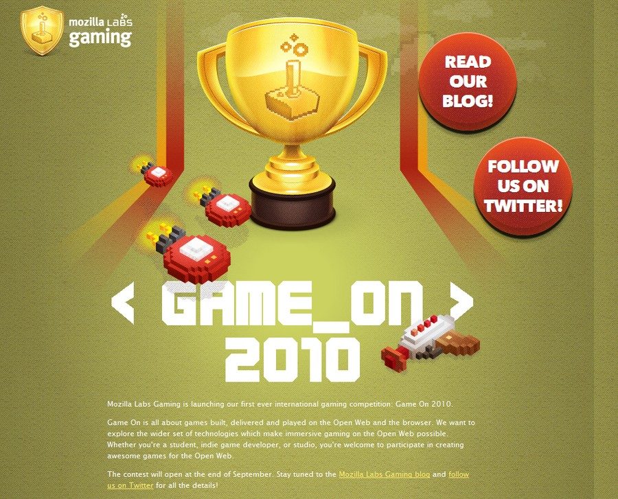 « Les jeux et les développeurs de jeux ont traditionnellement été à la pointe de la technologie, repoussant souvent les frontières du possible », écrit Pascal Finette. Pour lancer cette initiative, Mozilla va organiser fin septembre 2010 un concours international, Game On 2010. Il sera ouvert à « tous les développeurs intéressés dans la création de jeux qui utilisent les dernières technologies du Web ouvert ». Mozilla Labs donnera bientôt davantage de détails.