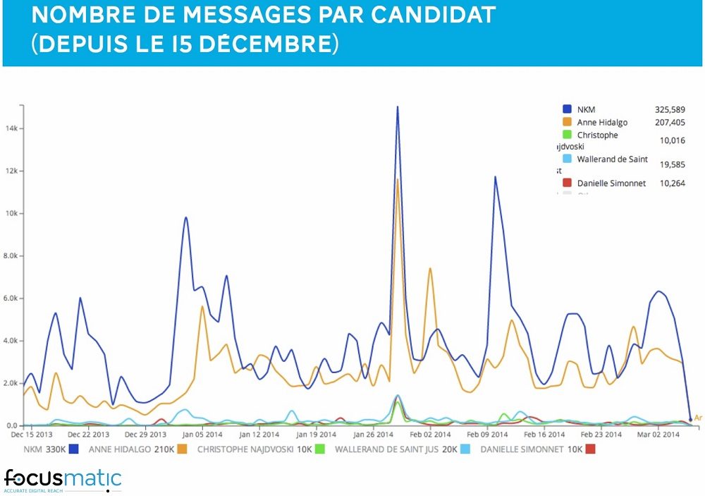 Le plus gros pic d’audience du graphique correspond au premier débat NKM/Hidalgo le 29 janvier dernier. “D’une manière générale, la télé a un impact fort sur les réseaux sociaux. Chaque passage sur une chaîne génère un pic d’audience. C’est le cas pour Anne Hidalgo le 02 février quand elle parle dans l’émission BFM politique, par exemple”, analyse Amirhossein Malekzadeh. L’audience des candidats peut aussi être boostée grâce à des prises de position sur certaines thématiques. C’est le cas en ce moment même au sujet des deux roues depuis que NKM a proposé de maintenir la gratuité pour leur stationnement. Enfin, il y a les buzz qui échappent aux équipes de campagne : comme celui de la photo de l’affiche de Anne Hidalgo qui avait suscité beaucoup de commentaires quant à d’éventuelles retouches sur Photoshop…