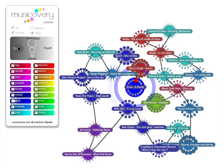 et une flèche pointe l’ordre de la diffusion. L’internaute visualise en un coup d’?”il tout le programme musical à venir.Ce joli schéma coloré n’est pas totalement inédit. Musicovery utilise l’interface Liveplasma (lancée en 2004 sous le nom