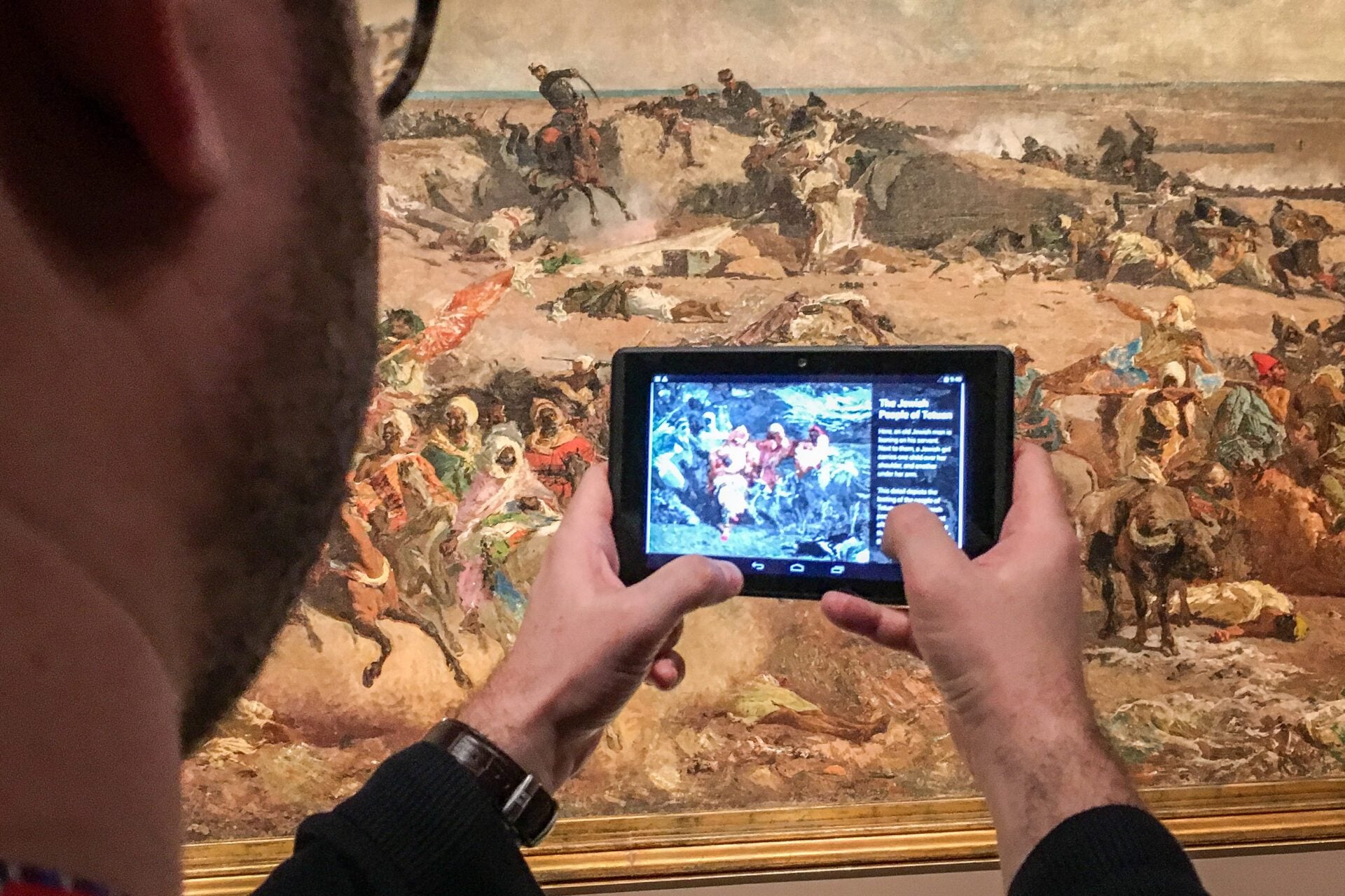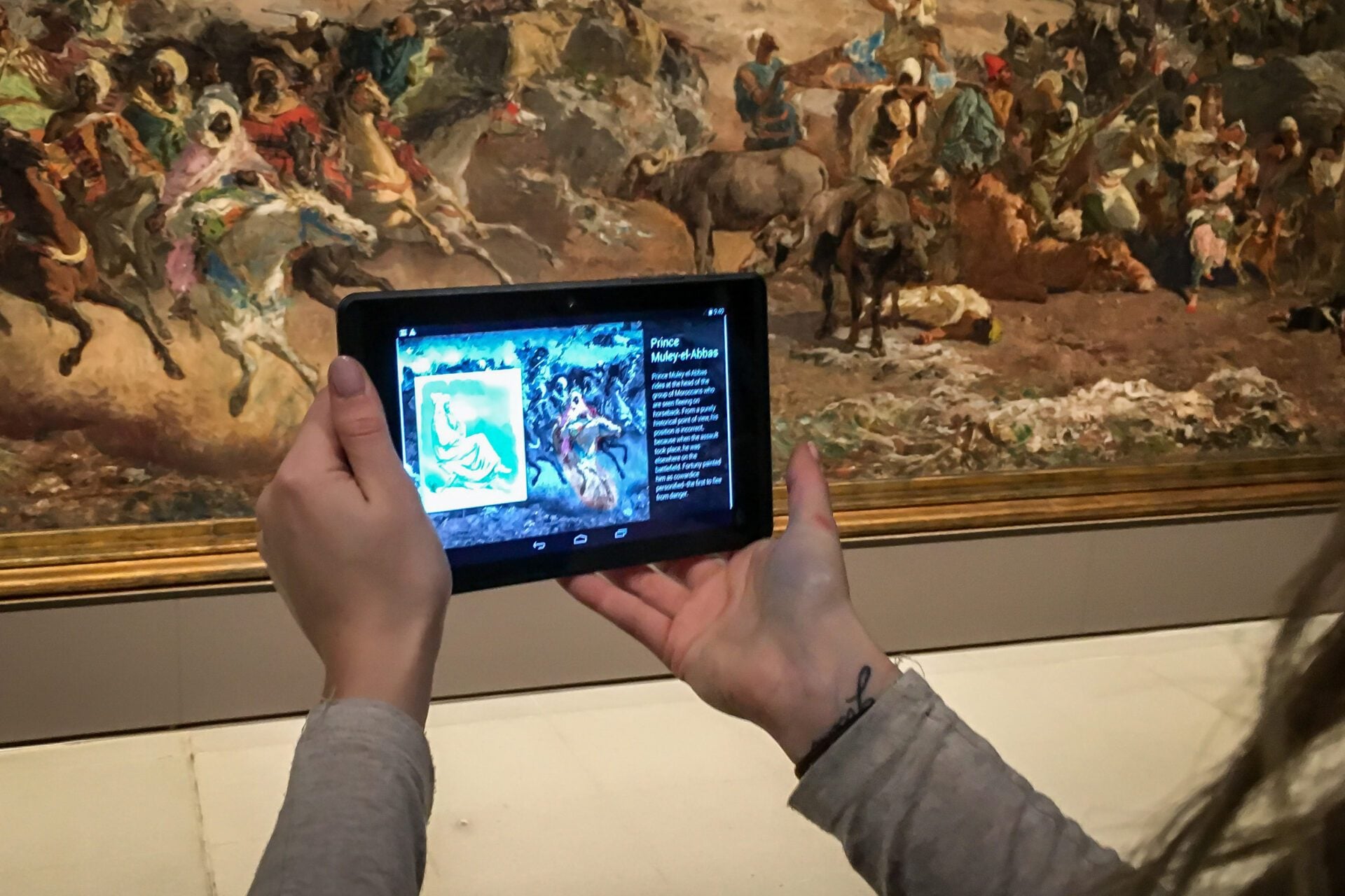 Grâce au mapping, encore une fois, la tablette sait exactement où sont situées chacune des oeuvres du musée. Au fil de notre visite, la tablette nous a proposé d’aller plus loin dans l’exploration de certaines d’entre elles. Face à La Bataille de Tétouan de Marià Fortuny, des pastilles affichées en réalité augmentée nous proposaient d’en savoir plus sur des aspects spécifiques du tableau. Au clic sur ces pastilles apparaissent alors à l’écran un zoom sur la zone concernée ainsi qu’une explication au format texte.