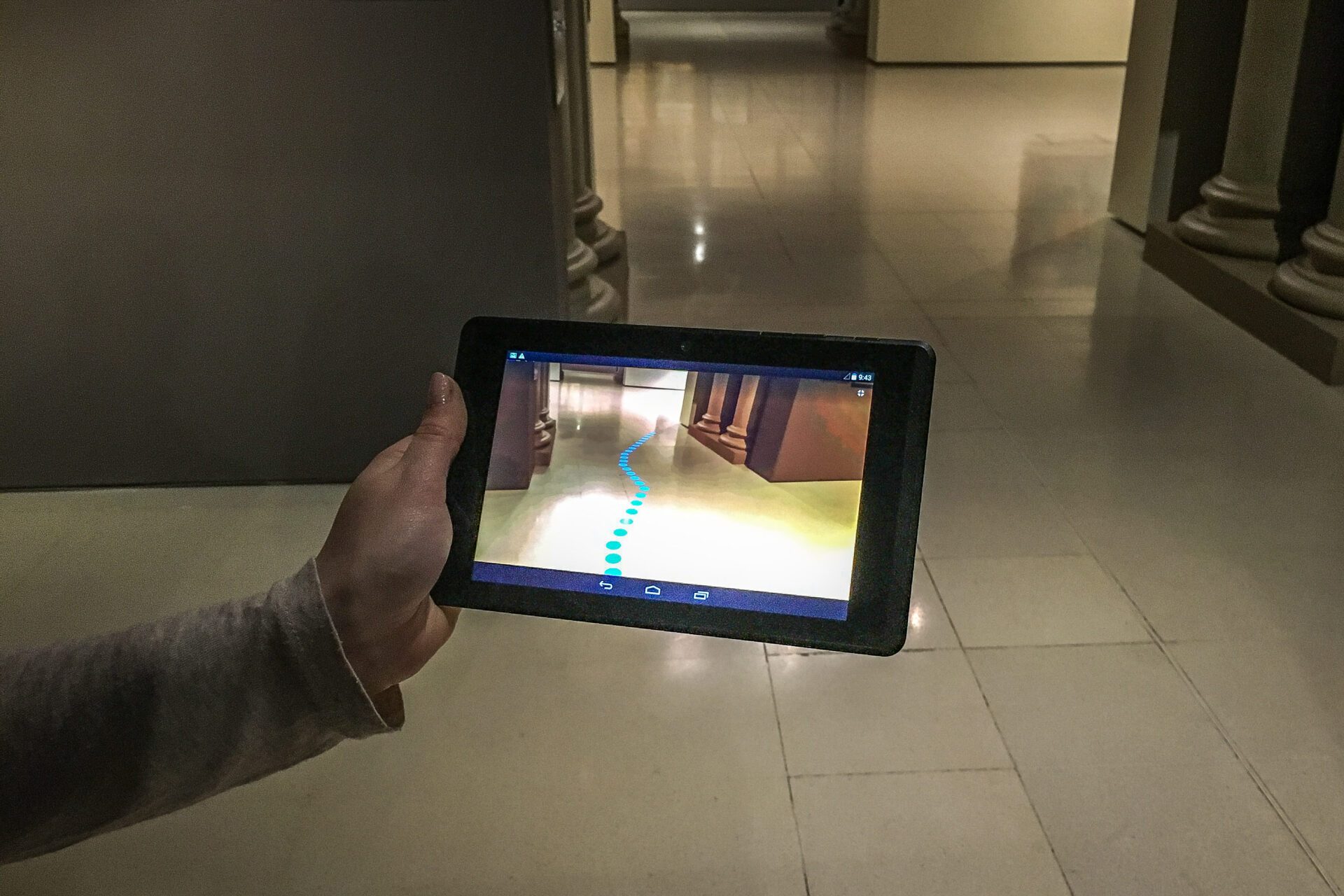 La tablette Tango de Lenovo entre les mains, nous avons entamé la visite du célèbre musée catalan. L’un des atouts de Projet Tango est la reconnaissance de mouvement associée à la perception de la profondeur de champ. Ainsi, la zone ayant été mappée au préalable, la tablette a été capable de nous guider sans avoir à utiliser le GPS ou une autre technique de géolocalisation. Et il faut bien admettre que la solution est en cela très efficace. Aller d’un point à un autre est très facile, d’autant que l’écran affichait une ligne bleue en réalité augmentée qu’il suffisait de suivre pour arriver à bon port. A moins d’être à court de batterie, il devient ainsi très difficile de se perdre.