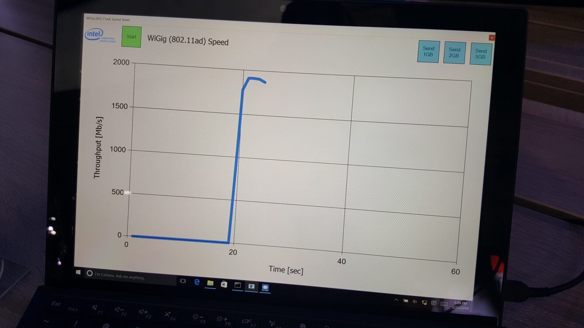 En un clic, le fichier part et le smartphone indique alors le débit descendant du fichier qu’il télécharge. Et c’est impressionnant ! On lit à l’écran près de 2 Gbits/s. Il faut ainsi moins d’une dizaine de secondes pour transférer le fichier de 2 Go. À noter qu’Intel précise que les premiers tests menés prouvent que la vitesse de 2 Gbits/s est atteignable si la portée ne dépasse les 10 mètres et sans obstacle. Soit, de quoi servir des collaborateurs dans une salle de réunion avec un super réseau. Au-delà, à 20 mètres, on peut espérer flirter avec les 800 Mbits/s.