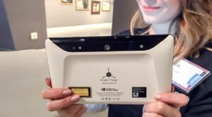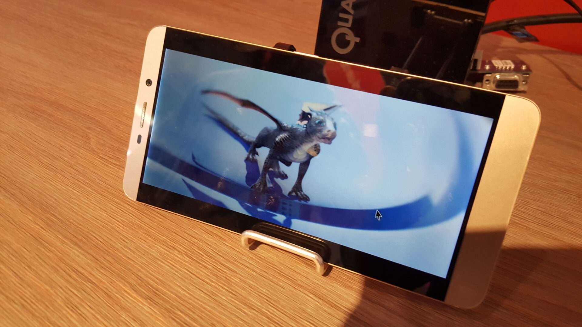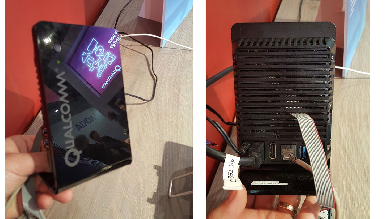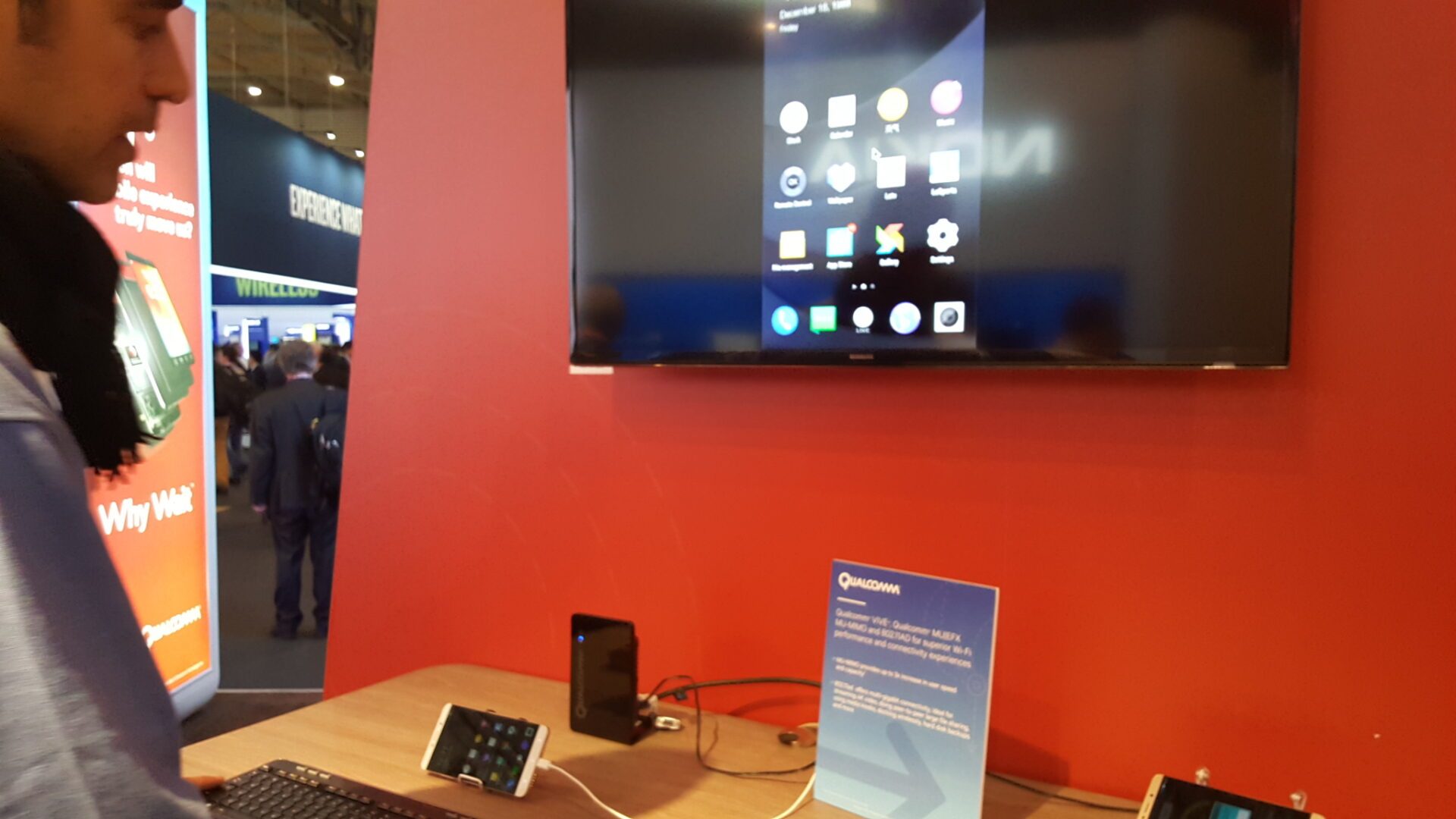 Tout à côté, on retrouve le smartphone avec le processeur Qualcomm SnapDragon 820 qui communique cette fois-ci en Wi-Fi 802.11ad avec un étrange boîtier noir Qualcomm. Conçu pour expliquer les usages rendus possibles par un tel débit, ledit boîtier intègre notamment une prise HDMI qui permet d’afficher l’image du smartphone sur le TV installé.
