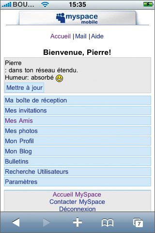 Ne cherchez pas le foisonnement habituel du réseau social cher aux artistes sur la version mobile de MySpace, vous seriez déçu. Exit les animations et les bannières. Mais, du même coup, exit aussi la pub ! La version mobile est