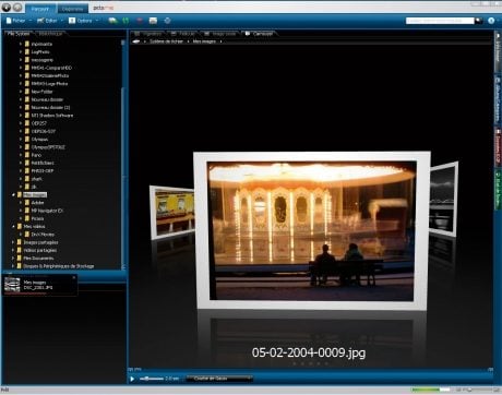 trouve un mode carrousel en 3D qui fait un peu songer au coverflow d’iTunes, des diaporamas avec des effets de transitions spectaculaires et un système de localisation géographique des images.