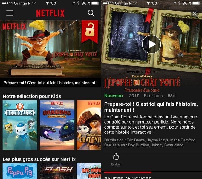C’est l’histoire d’un personnage enfermé dans un livre et dépendant du choix de ses lecteurs. Voici la trame de L’Epopée du Chat Potté prisonnier d’un conte. Produit par Dreamworks, cet épisode de l’excellente série du Chat Potté inaugure un nouveau genre sur la plateforme de Netflix : des fictions interactives pour enfants. Ce premier jet est disponible partout dans le monde sur la plupart des smart TV, consoles de jeux, appareils Roku et les terminaux tournant sous iOS. Mais pas encore sous Android ni sur une télévision équipée d’une Apple TV ou de Chromecast.