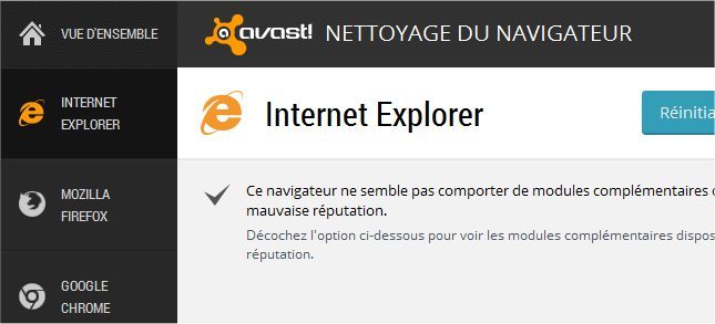 En complément, donc, Avast propose un outil indépendant baptisé Nettoyage du navigateur. Sa fonction est de détecter et supprimer (plus exactement, vous proposer de supprimer) les extensions, modules complémentaires, réglages de recherche et barres d’outils qu’il considère comme parasites.