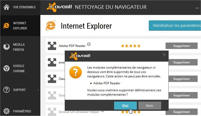 Lorsque vous décochez alors la case Exclure les modules complémentaires disposant d’une bonne évaluation située en bas de la fenêtre (après avoir sélectionné un navigateur), Avast affichera tous les modules détectés. Vous pourrez alors choisir d’en supprimer certains que vous jugez indésirables (bien qu’Avast ne les ait pas signalés), en cliquant sur le bouton Supprimer puis en confirmant la suppression. Attention : c’est une opération irréversible.