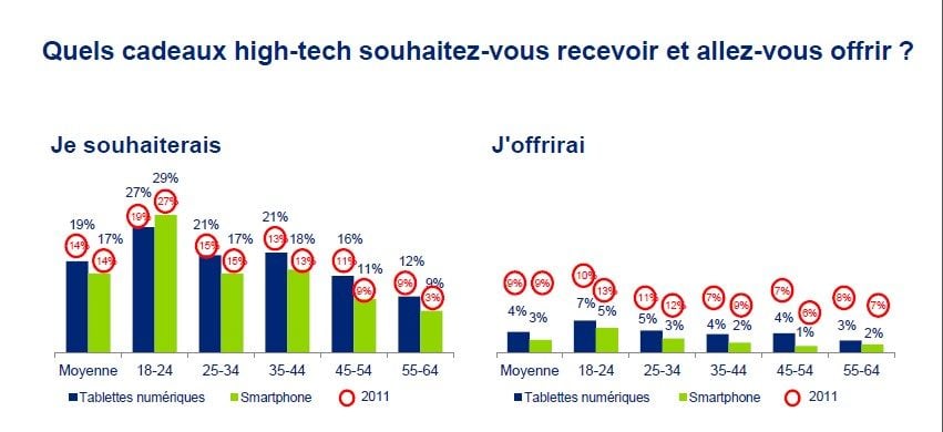Comme depuis trois ans, l’argent, les livres et les chèques cadeaux composent le podium des cadeaux attendus en France comme dans le reste de l’Europe. Les appareils high-tech n’apparaissent toujours pas dans ce top 10. Pourtant, le souhait de trouver sous le sapin des produits innovants tels que les tablettes et smartphones enregistre une progression constante, respectivement à 19 % et 17 %, notamment les tablettes chez les 18-44 ans qui progressent de plus de six points.
