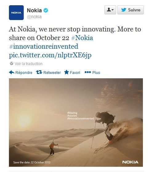 Le rachat de Nokia par Microsoft ne va pas l’empêcher de poursuivre ses propres opérations. Le fabricant de téléphones s’est fendu d’un tweet le 17 septembre 2013 pour rappeler qu’il n’a « jamais cessé d’innover » et qu’il en dirait « plus le 22 octobre ».
