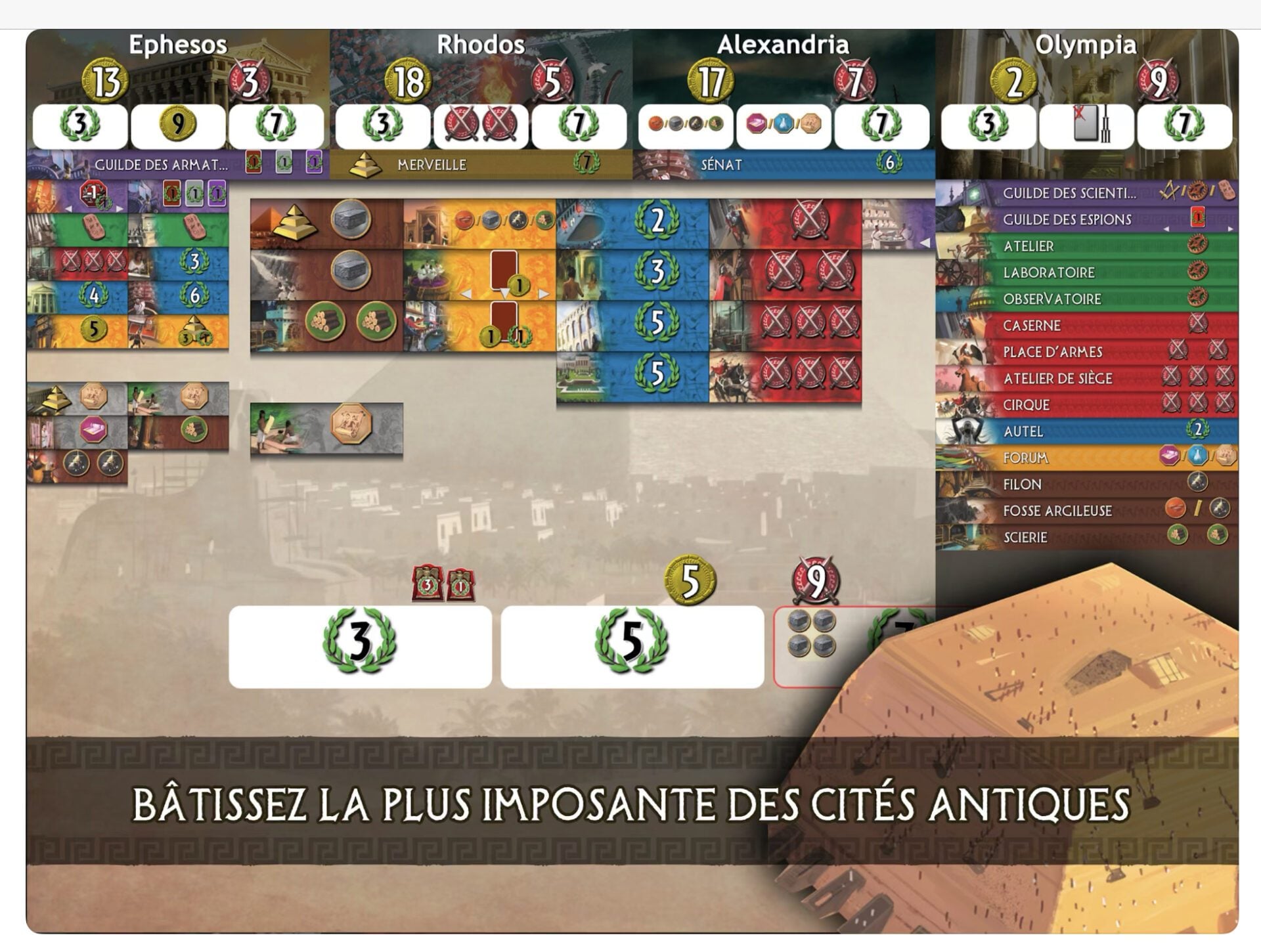7 Wonders, à ne pas confondre avec 7 Wonders Duel, est un jeu de cartes/stratégie lui aussi adapté d’un jeu de plateau multi-récompensé. Le portage, assez fidèle, invite le joueur à incarner le gouverneur d’une cité antique dans ce qui ressemble à une guerre de civilisations. Jouable jusqu’à sept joueurs simultanément, il excelle par la fluidité et la rapidité de ses parties. Si vous cherchez un jeu de société relativement complexe mais qui ne bloque pas une soirée entière pour être joué, 7 Wonders pourrait être l’élu.