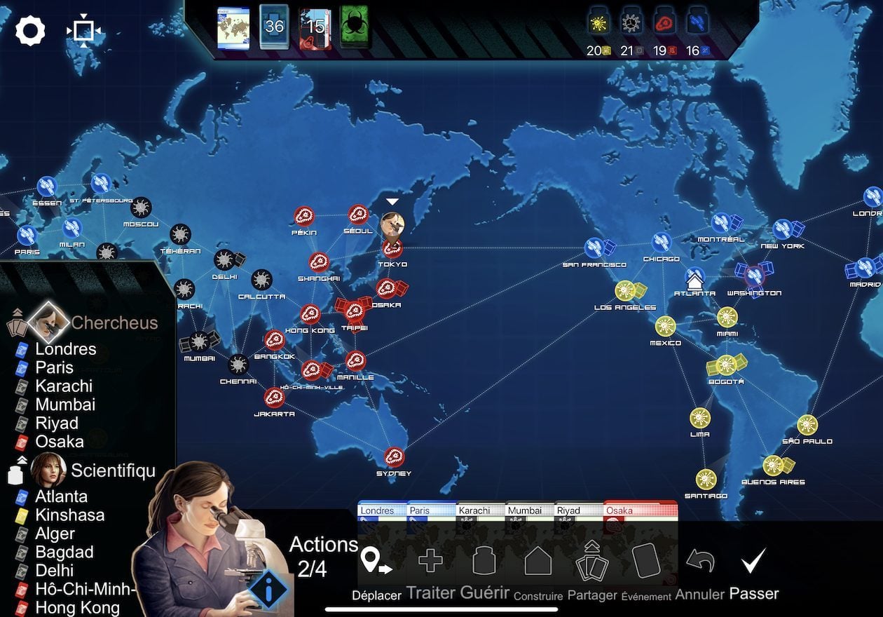 Les parties de Pandemic peuvent compter jusqu’à 5 joueurs et sont généralement bien rythmées. Le fait de devoir se déplacer aux quatre coins de la planète aurait pu être préjudiciable à la lisibilité du jeu mais il s’agit là d’un portage vraiment réussi avec une interface claire et intuitive. Malheureusement Pandemic souffre d’un défaut majeur : il est dépourvu d’un mode multijoueur en ligne. Et sur les versions iOS et Android c’est encore plus chiche puisqu’il n’y a même pas de mode “coop” en local.