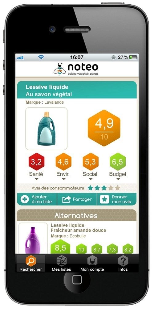Savon, gel douche, café, fromages : Noteo note des milliers de références de consommation courante (hygiène-beauté, entretien, alimentation, boissons non alcoolisées) selon quatre critères : environnement, santé, social et budget. « Le dispositif de notation repose sur une analyse scientifique sans équivalent, validée par des experts indépendants, nous explique le fondateur du site. Ce contrôle garantit notre sérieux. C’est très important. » L’accès aux résultats est enfantin, comme le montre la vidéo ci-dessous. Il suffit de télécharger l’application Noteo sur son smartphone (sous Android ou iOS), de scanner le code-barres du produit choisi afin d’obtenir illico un feu rouge, orange ou vert, soit une note de 0 à 10 pour caractériser les risques sur la santé et l’environnement. Ainsi le consommateur peut choisir entre le shampooing A ou B en toute connaissance de cause.