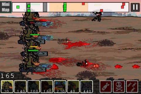 Massif massacre Ici, tout se joue en 2D à l’ancienne, sur une carte linéaire. Ça a l’air simple et ça l’est, tout au moins lors des premiers niveaux, qui ne sont que des jeux de massacre de masse, dans un pur style abattoir. Cela devient ensuite beaucoup plus tactique, avec l’arrivée de nouvelles unités et des bombardements : timing et précognition deviennent alors vos deux principaux atouts. La 2D stylée suffit parfaitement à traduire l’âpreté et le gore des combats, où la gerbe de sang est généreuse tandis que la cervelle se tartine à l’envi. Le format court des parties en fait un titre idéal dans les transports en commun du matin, où, après tout, on est souvent entouré de zombies qui nous font parfois nous sentir comme un alien.