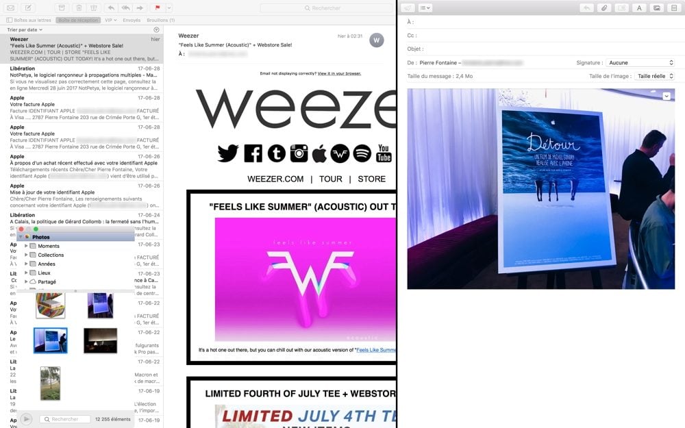 La première séduira les adeptes du plein écran, qui demeure un bon moyen d’éviter les distractions quand on veut se concentrer sur une tâche. Ainsi quand on est dans Mail en plein écran et qu’on souhaite créer un nouveau courriel, la fenêtre du message s’affiche telle à droite de l’interface principale, ce qui permet de conserver un œil sur différents mails pour pouvoir répondre à plusieurs points d’un coup d’un seul, par exemple.
